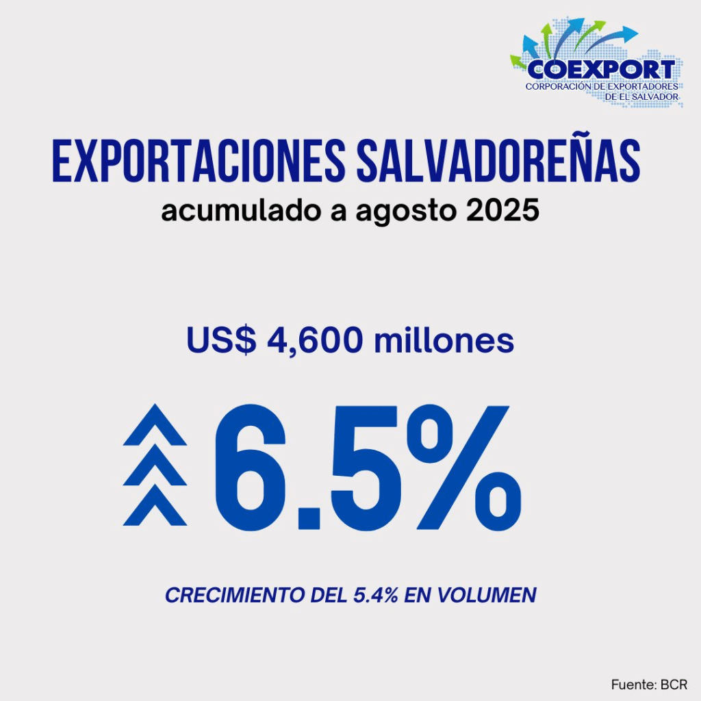 Las exportaciones de El Salvador sumaron US$4,600 millones entre enero y agosto de 2025, lo que representa un crecimiento interanual de 6.5%, de acuerdo con datos de la Corporación de Exportadores de El Salvador (Coexport). En términos de volumen, el dinamismo también fue evidente, con un aumento de 5.4%, lo que refleja una combinación favorable de mayores cantidades colocadas y un leve repunte en precios internacionales.